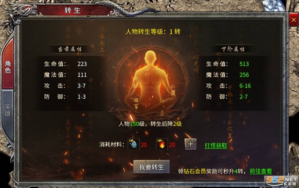 玩家可以使用收集到的一定数量的地狱火与天精岩来转生,这两个材料在打怪的时候就会掉落。RMB玩家只需要充值就可以轻松转生,玩家在达到一定等级就可以转生,无论角色还是英雄转生是提高属性上限的重要方法,只不过转生之后等级会有一些下降,这个情况是正常的,多打几次怪即可轻松回升。