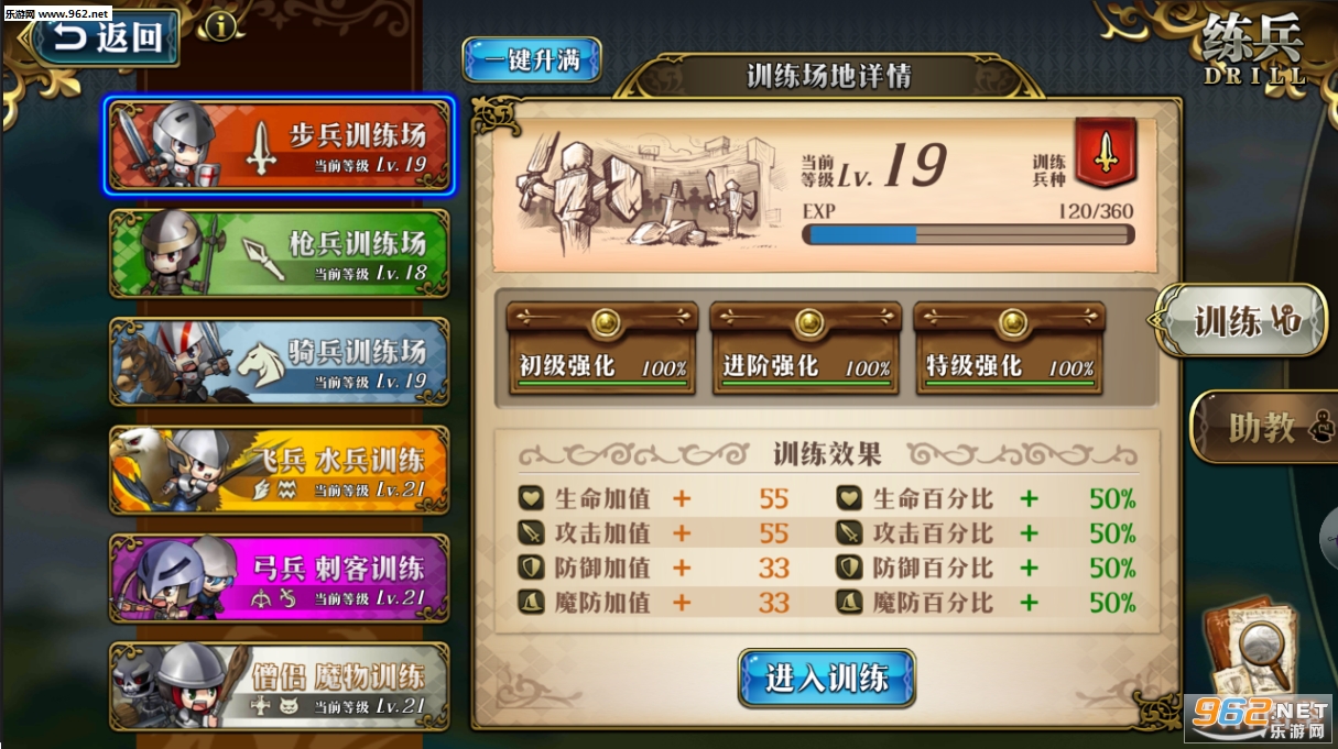 在练兵场中,我们可以看到所有兵种的训练场。分别为步兵,枪兵,骑兵,飞兵,水兵,弓兵,刺客,僧侣,魔物。