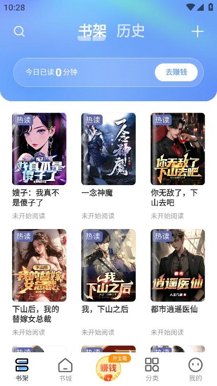 1、书架中,你可以添加自己兴趣的书籍作品,查看阅读历史与自己的阅读时长;