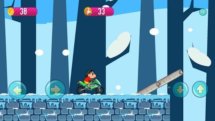 游戏玩法非常简单,用前后两个按钮控制小新的摩托车,帮助小新到达终点!