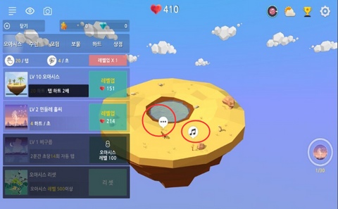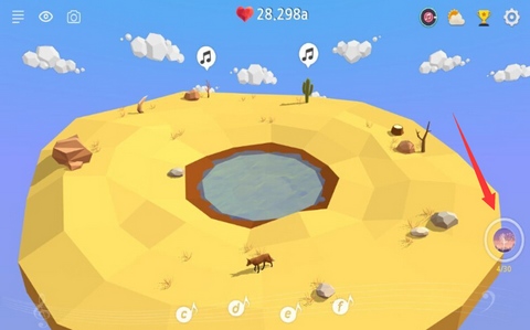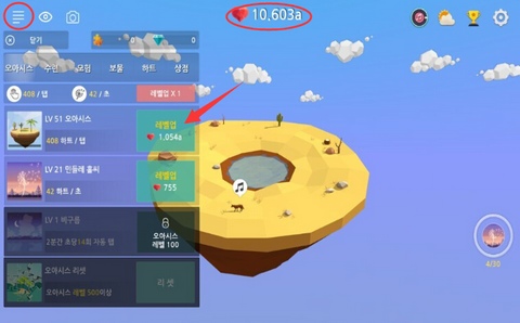 点击左上角菜单按钮可以打开创造界面,在这里可以通过消耗一定爱心(爱心的总数显示在屏幕正上方)给绿洲提升等级,达到一定等级即可解锁一些动物和植物,让绿洲变得更丰富。