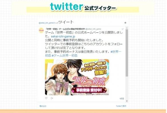 官方发布了游戏“世界第一初恋”的网站。http:// sekai-ichi-game.jp 事先预约也在发布的同时开始。
