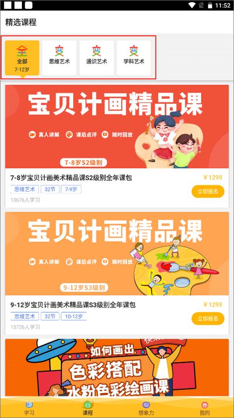 1、同样还是切换到【课程】这个页面,它分为思维艺术、通识艺术、学科艺术这三个方面。选择其中一类并选择你要报名的课程。