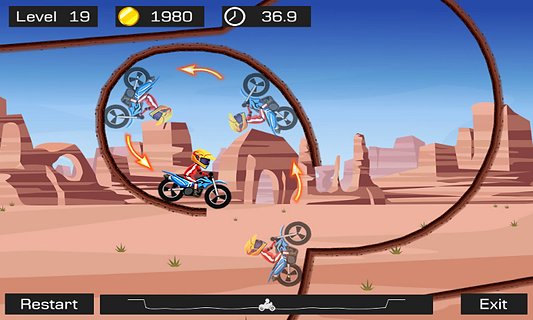 《极限飞车破解版安卓》这是一个摩托特技竞速游戏,操作简单,但是要得到高分需要技巧。控制摩托车尽快的通过精心设计的道路到达终点。得分越高,得到的金币就越多。在空中旋转360度可以获得额外的奖励。