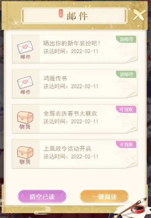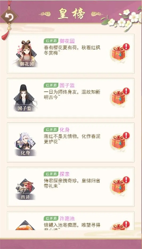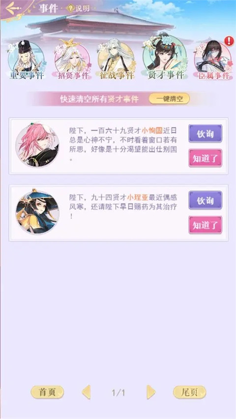 11、事件(通关灵境关卡2-9开启):事件中包含了皇子出仕结缘相关事件和后宫事件等等,及时通知陛下宫中大大小小事宜,成为陛下管理后宫的好助手。