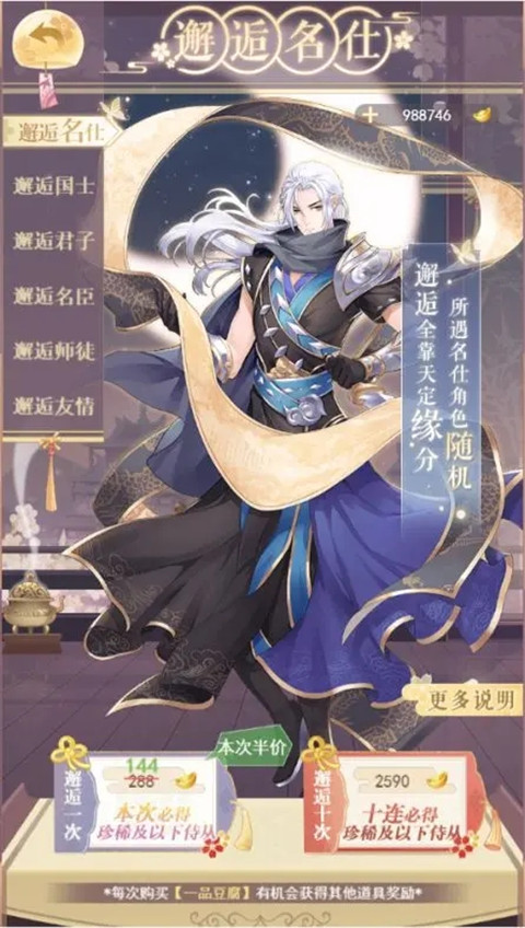 4、邂逅(3级开启):陛下可在邂逅中消耗货币,获得丰富的道具和侍从,达到vip11级还可开启邂逅国士~有机会获得更优秀的侍从哦!
