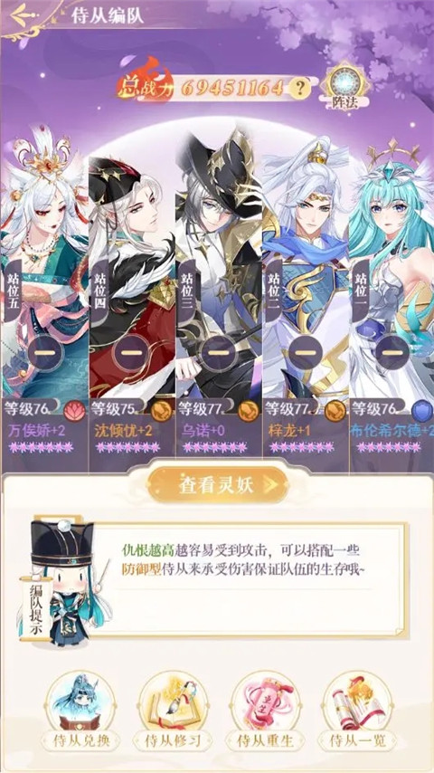 3、侍从(1级开启):在侍从界面可以通过升级、升星、点技能、血脉关联、装备进阶、封印、九字真言等方式培养侍从,从而提升侍从的战力,在战斗中取胜。