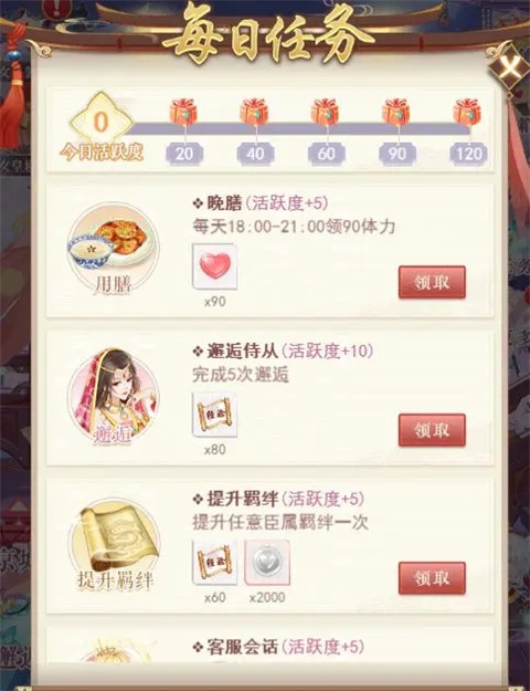 7、任务(通关灵境关卡1-7开启):除了灵境以外,任务是陛下获得大量经验的重要途径之一,也可获得锦鲤、元宝等丰厚奖励,还有不要忘记早中晚到任务中领取限时体力哦!