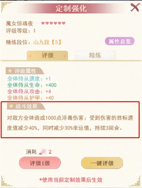 收集整套6心定制装扮后可以使用该装扮的战斗效果,同时可以定制强化,提高战斗效果,精炼需要消耗与子同袍,开了同袍系统的陛下才有哦