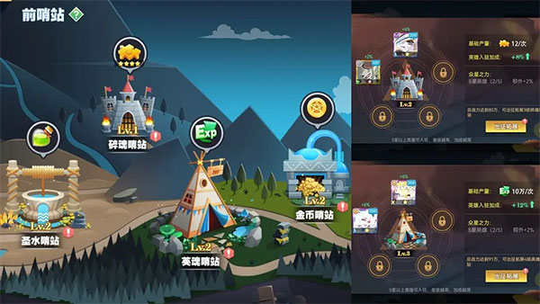郊外的【前哨站】是针对性获取资源的好地方,这里有专门产出圣水、经验、金币、碎魂的副本,派驻英雄后,会根据英雄星级带来不同的额外资源加成,正在升级的英雄反过来也可以加速资源获得,形成正循环。
