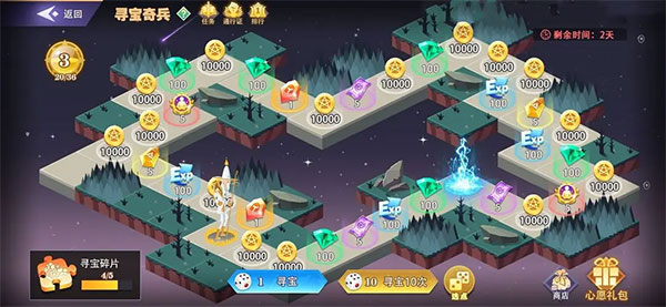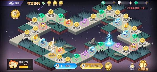 【寻宝奇兵】通过类似大富翁的玩法,能够快速获得金币、钻石、招募令、圣水和其他素材,所需的骰子在日常挂机中就能获得,每天收获资源之后记得来这里,每个格子都有奖励,非洲酋长不存在的。