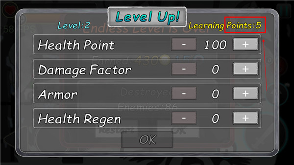 5、等级提升后还可以获得技能点,从上到下分别为:血量、攻击力、防御、恢复。根据自己的喜好来加点。