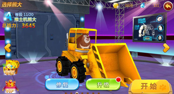 1、开局熊大行驶卡车,熊二则是持驾飞机,别瞧这仅是平民装,合体后战力不容小窥,开始前修复一下。2、点选关卡后,将主目标视为整局的战斗目的,另外时间把控好,在拯救小动物时不可多费时,然后“开始”。