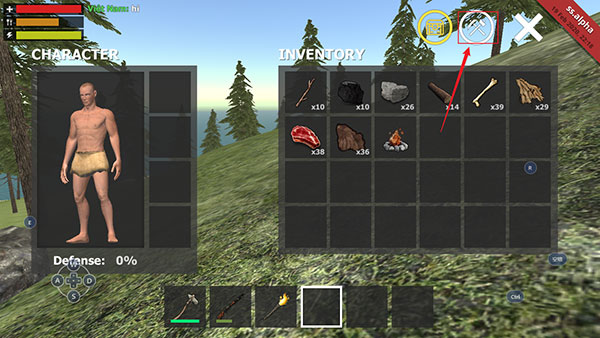 6、搭建完成后,可以在INVENTORY中看到一个营火图标,拖动这个图标到石斧等一行的那6个小框框中。