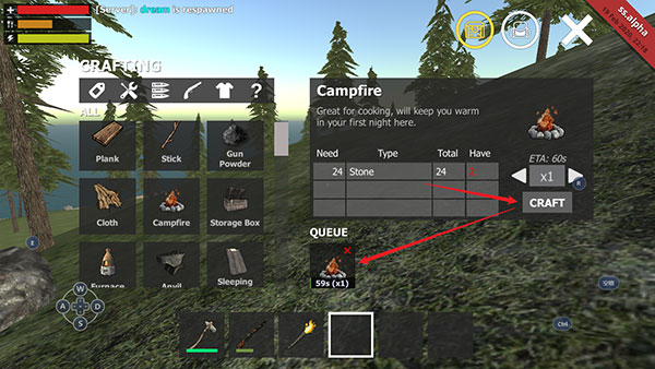 5、那么请拿起你的小斧头去石头上砍几下获取足够的石头,不过由于小编带来的是破解版,所以玩家们只需要进游戏商店内购买Stone(石头)即可,不过也可以直接购买Campfire。