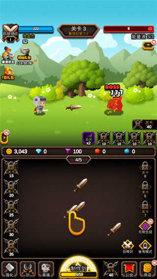 将自动制造的剑放到合成面板,然后将它们拖到相同的剑上,然后将它们合成以制作更坚固的剑。通过无尽的合成,召唤更加强大的宝剑,以击败即将来临的敌人。