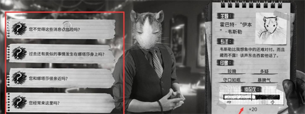 4、点击盘问之后,可以问各种问题,然后根据侦探仪判断对方有没有说谎