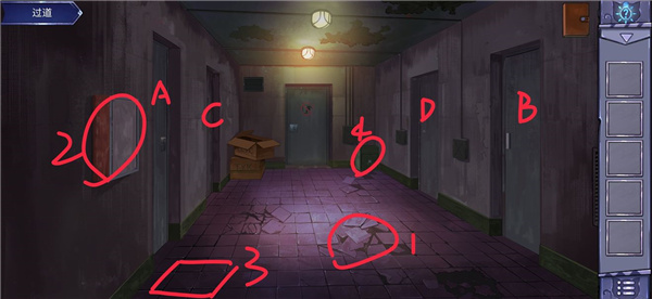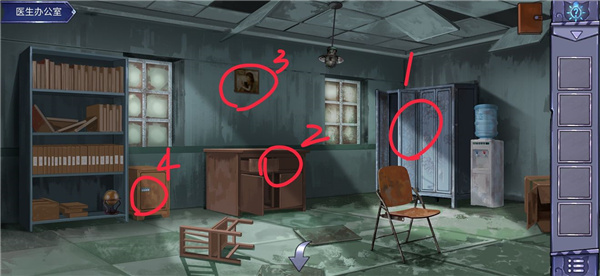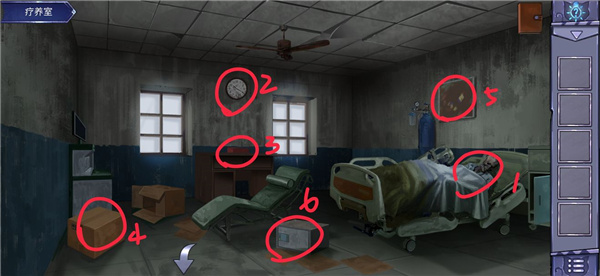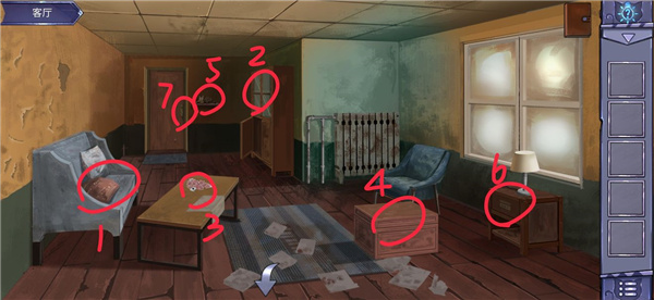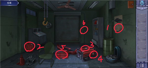 基本每个场景都会清空道具和谜题,很少有跨场景的谜题,场景首图上会用红圈,把可互动物品圈起来并编号(前几个场景编号有点混乱,之后基本是按操作顺序编号的)【开场场景-仓库】