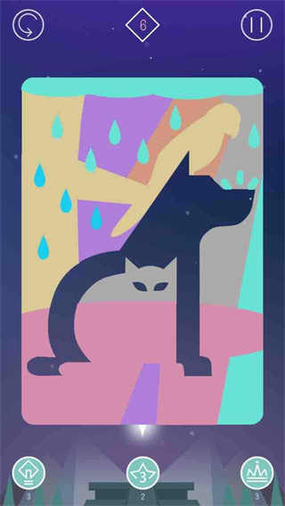 【境界线上的偶遇】首先使用绿色覆盖紫色。然后使用蓝色覆盖绿色。最后使用粉色覆盖黄色,然后使用粉色覆盖灰色,即可顺利过关!