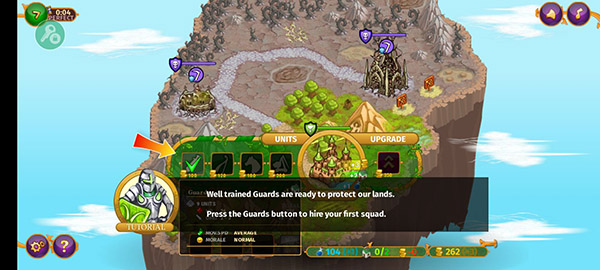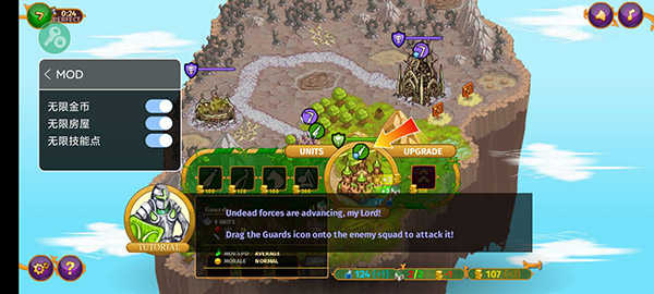 3、过关后能对各种兵种进行升级。点击基地或兵营,然后点击UPGRADE能进行升级。点击左下角的箭头能加速进行游戏。