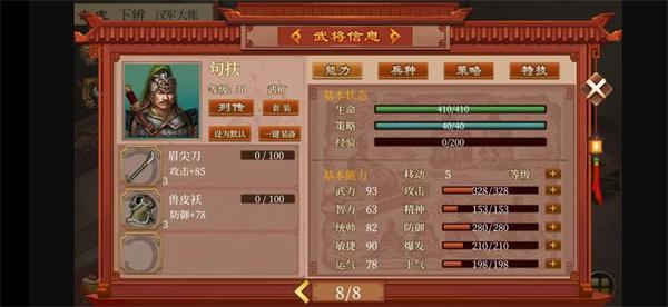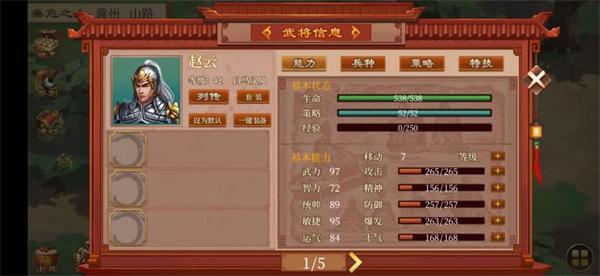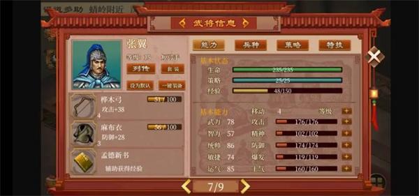 也是五星攻击的兵种,需要吃2进军鼓来补到五星,出场比孟琰晚一些,但是次数也不算少,难关经常作为主力出战。统帅也是是要吃12布阵令才能提档,但他天生敏捷有90,初始敏捷提档,五转之后吃5束兵征就变为四星,加上他的将技山战(山岳地形适应力增加15%),也有一定的自保能力,山岳作战的神,基本上一刀一个小兵,遗憾的是没有大招。因为是武师天生自带暴击率,因此也没有必要把士气补档。兵种选择武师或者义侠都可以
