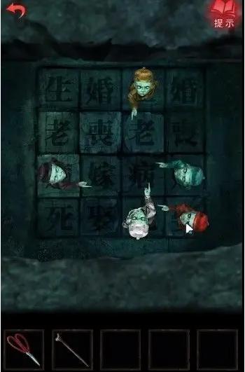 9、接着在妹子下去后男人调节福字机关的字,我们根据柜子上的字输入答案,答案就是死丧生死,男人即可获得凿子。