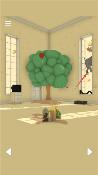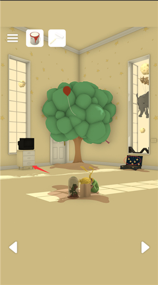 1、转到树的房间,点墙边的机关,密码见画板↑→↓↗;