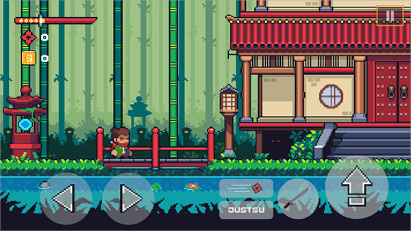 1、操控忍者左右移动、跳跃,可以点击攻击键使用武士刀攻击。