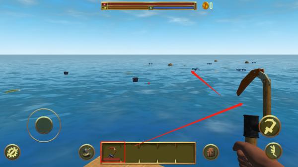 2、进入游戏将会在一块浮木上,玩家可以通过工具打捞海上飘荡的物品,制作以供生存的工具;
