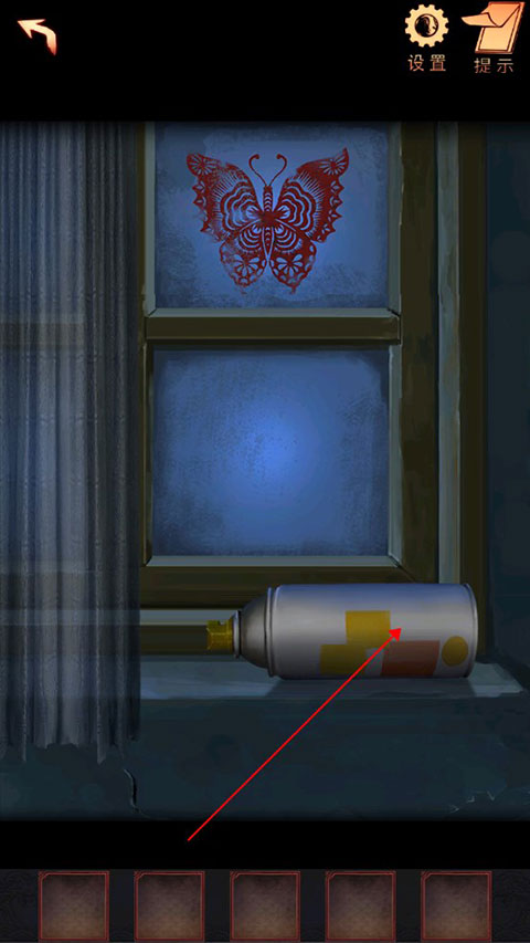 6、点击窗帘,获得道具喷漆罐,获得线索,红色的蝴蝶。