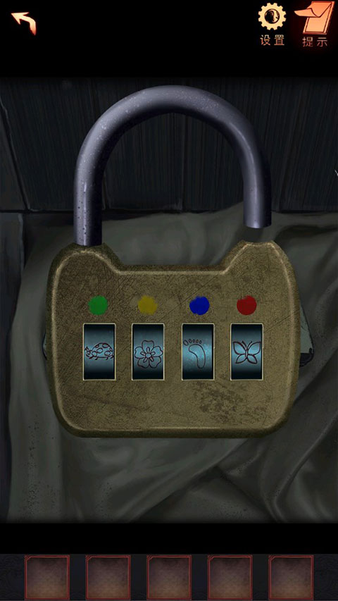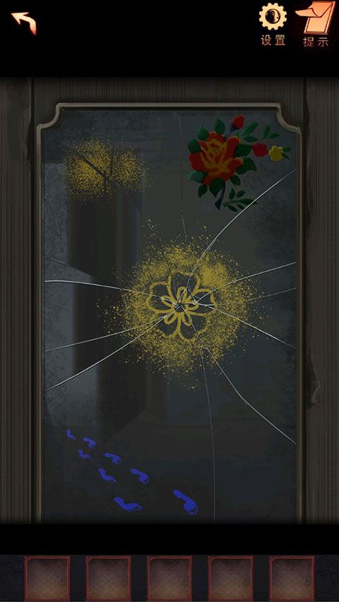 7、点击柜子上的镜子,使用喷漆罐,获得线索:黄色的花瓣和蓝色的脚印。