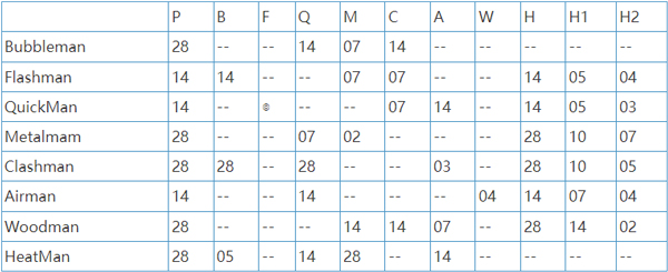 最上面一行是各种特殊武器简称,P是普通弹,H指H特殊武器通常弹,H1指H特殊武器一级蓄力弹,H2指H特殊武器二级蓄力弹。BOSS们的HP上限全都是28点。表中数字的含义很明确,打倒BOSS所需命中次数。比如使用B特殊武器对付HeatMan,命中5次结束战斗。“--”表示该特殊武器对BOSS罔效。“◎”表示情况特殊,F特殊武器停止住QuickMan后,满能量情况下可以无条件扣掉Quickman半管HP,也就是14点HP的伤害值,然而主角在BOSS战里没有回复F特殊武器能量的手段,整场战斗里主角无法单独依靠F特殊武器搞定QuickMan,所以这里不谈F特殊武器的命中次数。还有,C特殊武器在爆炸期间有可能连续命中BOSS好几次,造成较大的伤害,表中的数据指的是命中次数,运气好时,有可能只用3发C特殊武器就能炸死个别BOSS,也就是说,3发C特殊武器爆炸期间累积命中了7次。