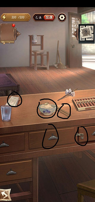 1、剧情结束之后就可以在房间当中寻找物品了,首先点击窗边可以获得脚印,在窗户位置可以得到窗户,点击桌面。2、在桌面的位置这里,在桌面上可以获得借据、一双竹筷、一碗白饭、点击下面的锁还可以的到抽屉上的锁还有中间抽屉的一叠汇票。
