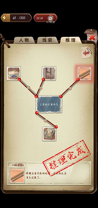 5、我们获得了线索,可以在这里进行分析,分析完成,然后添加到推理里,分析线索需要需要消耗能量,找寻线索要消耗体力,过段时间它会自动回复。