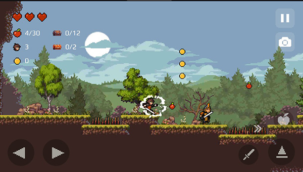 4、点击右下角的苹果图标,可以扔苹果攻击敌人,点击小剑图标挥动剑可以把箱子打烂,收集金币和道具,也能用它来攻击敌人。