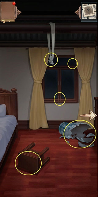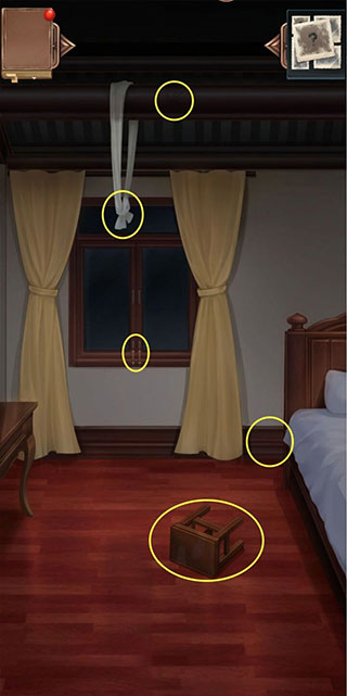 选择:第三条白绫、悬梁白绫2、悬梁白绫、房梁上的黑手印、第二只手印和第三只手印。