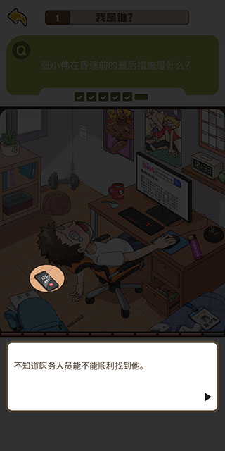点击地上手机即可找到线索。原来是拨打了120,不知道医务人员能不能顺利找到他。