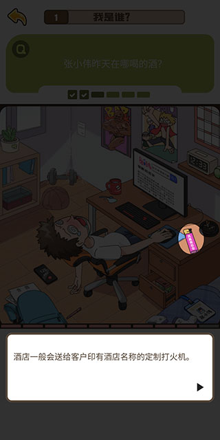 点击桌上打火机即可找到线索。原来酒店一般会送给客户印有酒店名称的定制打火机。