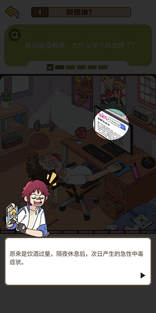 点击电脑屏幕即可找到线索。原来是饮酒过量,隔夜休息后,次日产生的急性中毒症状。