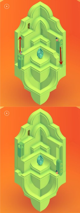3、第三个门的关键就是那个对上下的梯子,我们先把两个小人移动到两个楼梯的位置,记得左边的小人要在楼梯顶端,这样就能把一个顶上去,另个移动带下面的位置。