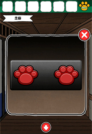 2、在走廊的场景切换到客厅,点击烤鱼旁边的猫爪印记,获得满是灰尘的按钮