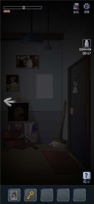 3、进入右边放着男孩雕像的房间,点击左上方的圆形相框,得到【钥匙】和另一个【神秘符号】。
