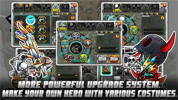 卡通防御战5破解版中,玩家需要点击屏幕控制英雄攻击靠近的敌人,战车的武器也会进行自动攻击,当然只是这样的话未免有些许枯燥,所以还有魔法攻击和突袭等手段对付敌人,而更高级的魔法和突袭方式需要打通更多的关卡来解锁