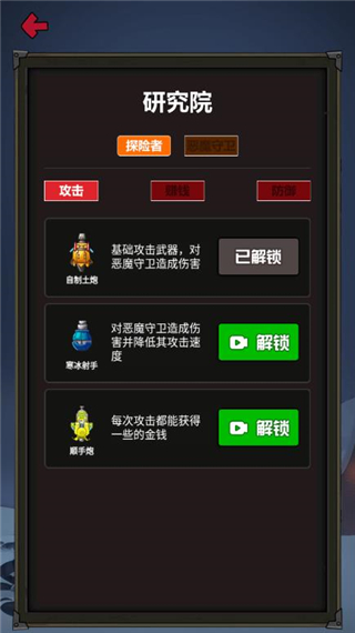 3、进入游戏首页界面,玩家可以点击开始游戏按钮,或者点击研究院按钮观察攻击炮台样式……