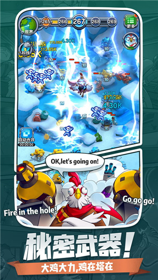1、挂机战斗,无限升级无需大量的手动操作,你只需要简单的合成升级你的炮塔就可以体验爽快刺激的塔防战斗。