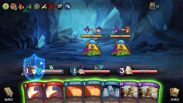 除了遇到事件以外,还会遇到怪物和BOSS的战斗,战斗中每个职业都有一定的行动力,根据不同的行动力进行卡牌利用,攻击、道具卡牌的可指向进行释放,且怪物头顶的也会为你指引其下个回合所释放的技能和对象。