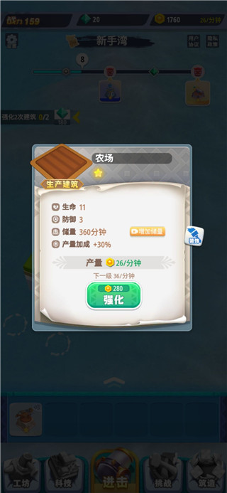 2、开局别把上图的【增加储量】点了,因为它送2小时收益!是金币和钻石的收益喔,等卡钱的时候一起点很爽的