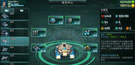 作战支援车“能量盾”形成的能量场可提升附近作战单位的装甲。能量场生成器消耗大量电力,所以保护场只能维持很短时间,之后能量盾需要时间重新充电。