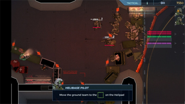 从新手教程开始,新手教程教给你的东西包括:缩放,旋转视图,移动,捡物品,近战(靠近敌人自动的),(移动时或静止时)手动射击,投掷武器,标记(单击敌人,会使敌人被集火),查看队员信息,抵抗感染,调整装备,学会多队员同时移动,空中/地面视角切换,直升机射击,了解飞机其中特别提醒