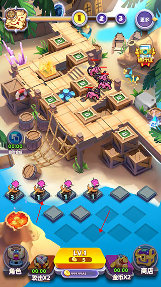 1、打开怪物你过来呀手游官方版,点击下方的金币购买弓箭手战士,两个相同的战士合并到一起可以升级,伤害更强,拖动它们到上方的防守位置,击败来袭的怪物们。
